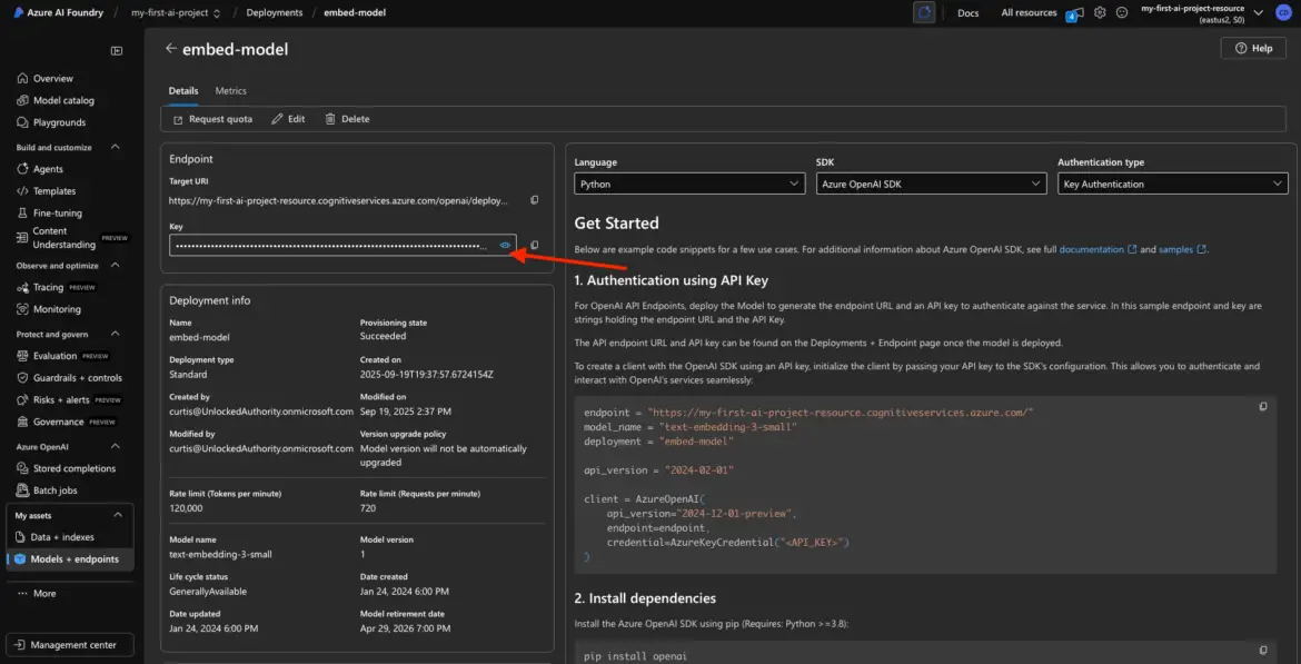 From the My Assets page in your project, click on the deployed embedding model (e.g., embed-model). This brings up its detail page with all the juicy bits: key, endpoint, status, and more.